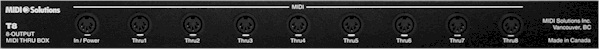 The MIDI Solutions MultiVoltage T8 is a 1-in 8-out MIDI Thru Box. All MIDI messages appearing at the T8's MIDI input are passed to each of its eight MIDI Thru outputs. Active circuitry cleans up any skewing of MIDI data bits that has occurred at the input, ensuring reliable operation in setups that require daisy chaining or long cable runs.